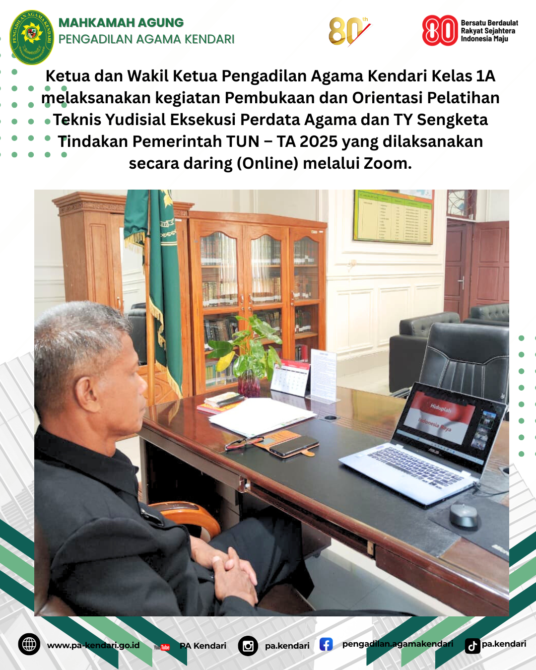 Ketua PA Kendari (Drs.H. Muslim, M.H.) dan Wakil Ketua Pengadilan Agama Kendari Kelas 1A (Drs. Mustafa, M.H.) melaksanakan kegiatan Pembukaan dan Orientasi Pelatihan Teknis Yudisial Eksekusi Perdata Agama dan TY Sengketa Tindakan Pemerintah TUN – TA 2025. Kegiatan pembukaan Pelatihan Teknis Yudisial Eksekusi Perdata bagi Hakim lingkungan Peradilan Agama/Mahkamah Syar’iyah Seluruh Indonesia ini di selenggarakan oleh Badan Strategi Kebijakan dan Diklat Hukum dan Peradilan Mahkamah Agung RI cq. Pusdiklat Teknis Peradilan secara virtual. Ketua dan Wakil Ketua PA Kendari berkesempatan mengikuti Pelatihan Teknis Yudisial Eksekusi Perdata bagi Hakim lingkungan Peradilan Agama/Mahkamah Syar’iyah Seluruh Indonesia.