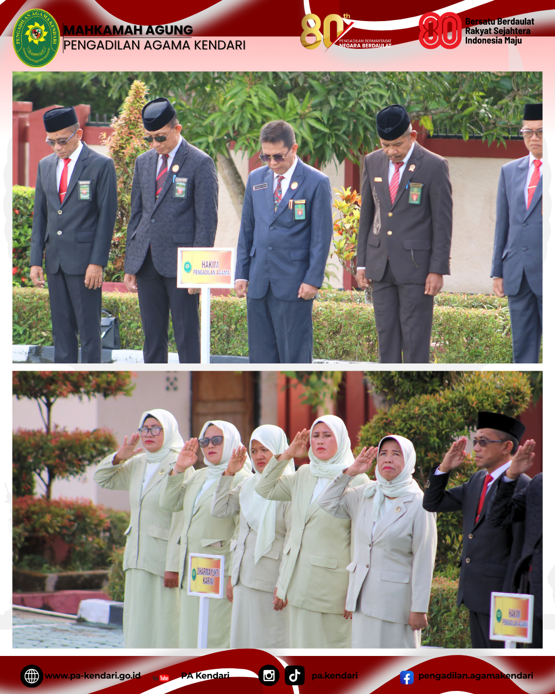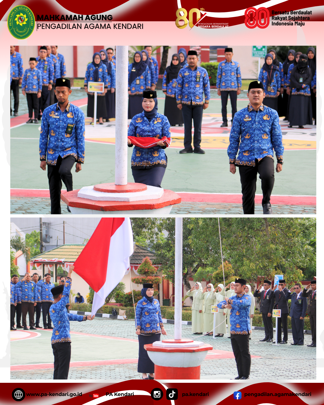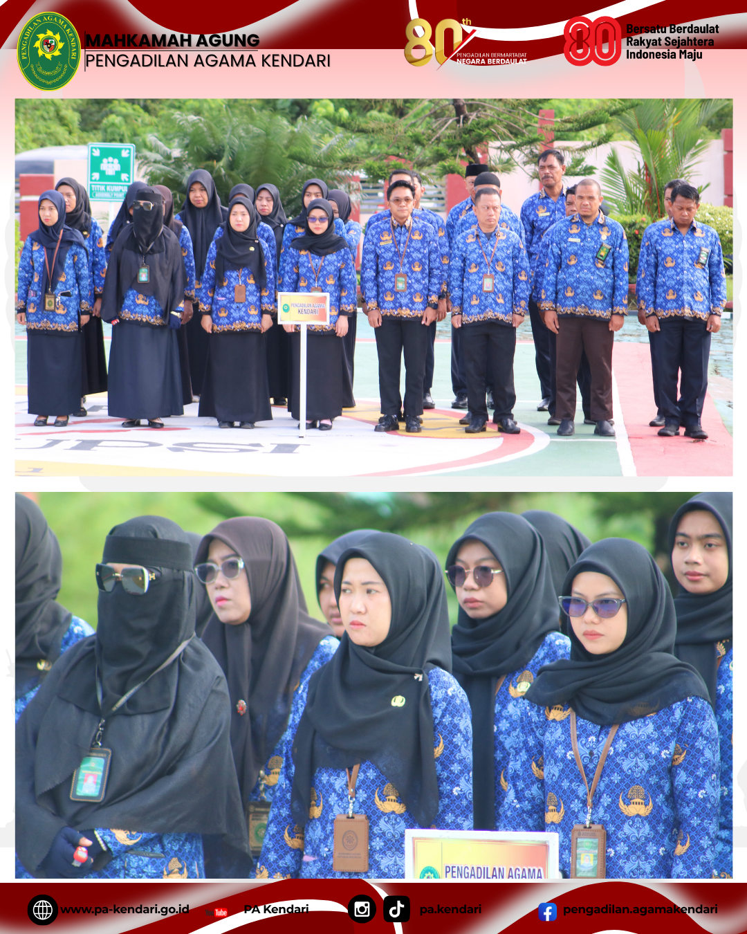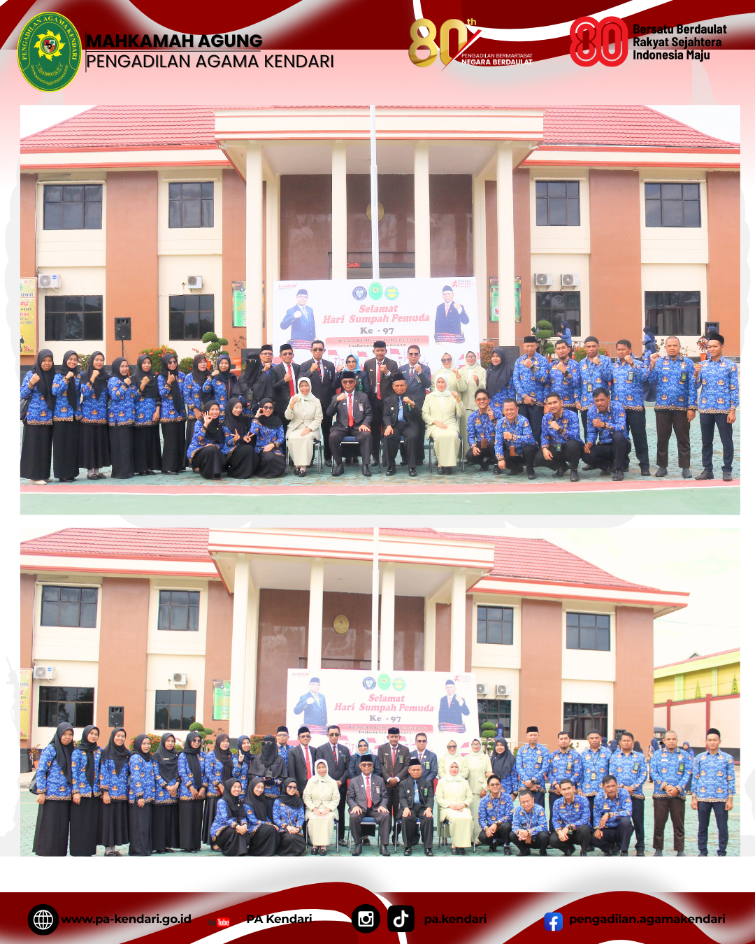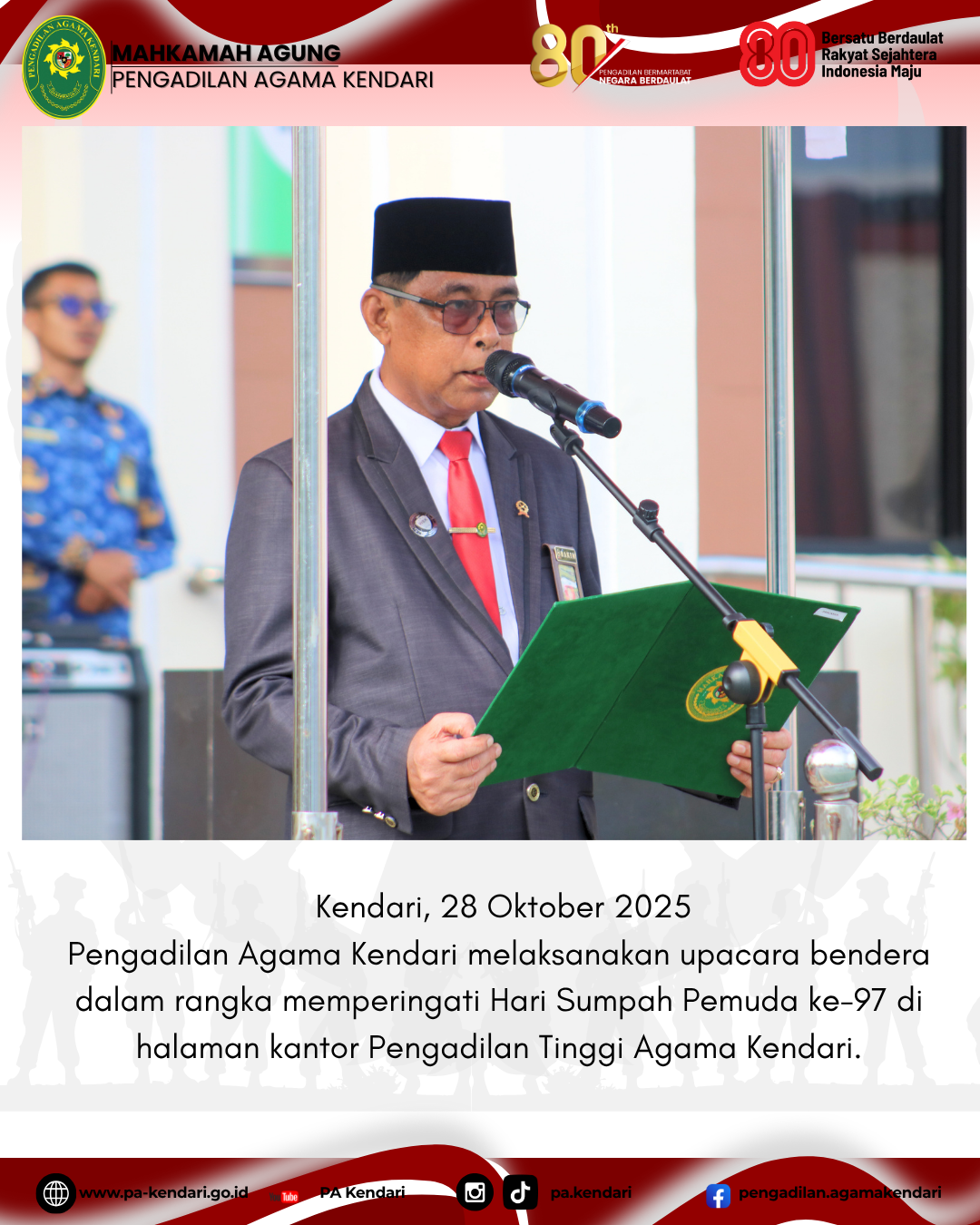 Dalam rangka memperingati Hari Sumpah Pemuda ke-97 tahun 2025, Pengadilan Agama Kendari melaksanakan upacara pengibaran bendera di halaman Kantor PTA Kendari. Tema peringatan Hari Sumpah Pemuda tahun ini yaitu "Pemuda Pemudi Bergerak Indonesia Bersatu". Tema ini mencerminkan semangat persatuan untuk kemajuan bangsa dan menekankan pentingnya kolaborasi para pemuda di Indonesia. Mari jadikan momen ini untuk bergerak dan bersatu demi kemajuan dan persatuan bangsa Indonesia.