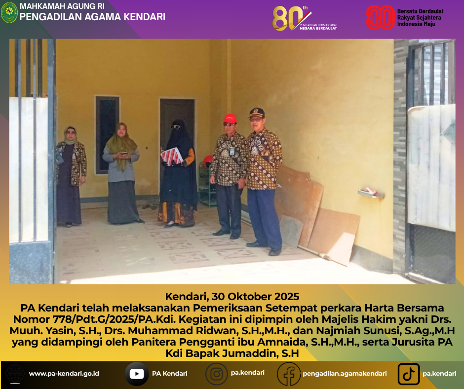 Sedangkan pemeriksaan setempat perkara Nomor 778/Pdt.G/2025/PA.Kdi dilaksanakan oleh Majelis Hakim yang terdiri dari Drs. Muh. Yasin, S.H., Drs. Muhammad Ridwan, S.H.,M.H., dan Najmiah Sunusi, S.Ag.,M.H yang didampingi oleh Panitera Pengganti ibu Amnaida, S.H.,M.H., serta Jurusita PA Kdi Bapak Jumaddin, S.H., juga turut mendampingi kegiatan ini untuk memastikan seluruh rangkaian kegiatan dapat berjalan dengan baik. Pemeriksaan Setempat ini berlangsung di dua lokasi yakni di Kelurahan Watulondo, Kecamatan Puuwatu dengan Objek sengketa sebidang tanah dan banguna 1 buah rumah serta lokasi kedua di Kelurahan Puuwatu, Kecamatan Puuwatu dengan objek sengketa dua petak tanah kosong.