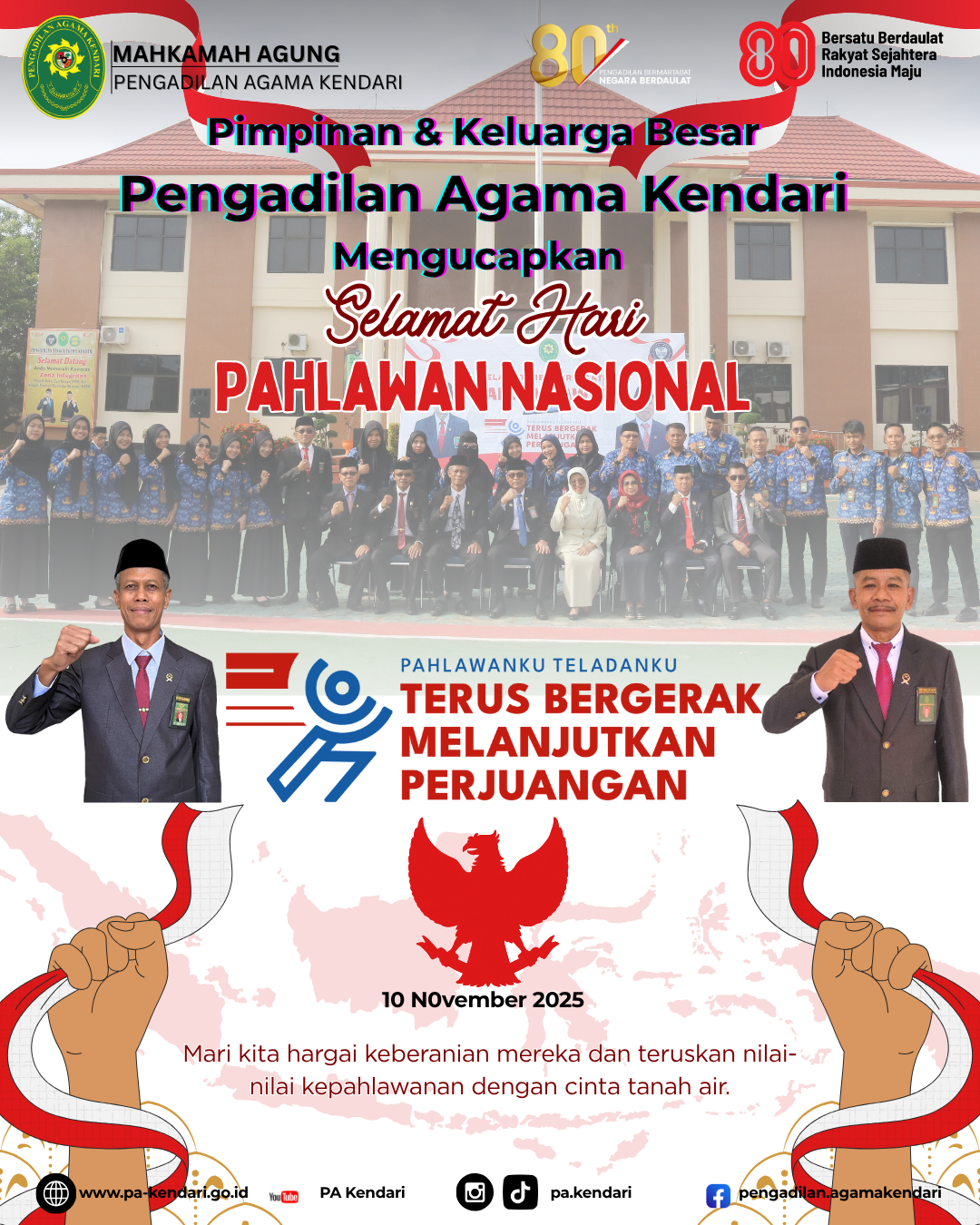 Upacara berlangsung tertib dan khidmat, diawali dengan pengibaran bendera Merah Putih diiringi lagu kebangsaan "Indonesia Raya", mengheningkan cipta untuk mengenang jasa para pahlawan, serta pembacaan teks Pancasila dan UUD 1945. Kegiatan ini bertujuan untuk memupuk rasa nasionalisme dan menghargai pengorbanan para pahlawan, sekaligus memotivasi seluruh aparatur Pengadilan Agama Kendari untuk memberikan pelayanan hukum yang terbaik dan berintegritas kepada masyarakat, sesuai dengan nilai-nilai Mahkamah Agung RI.