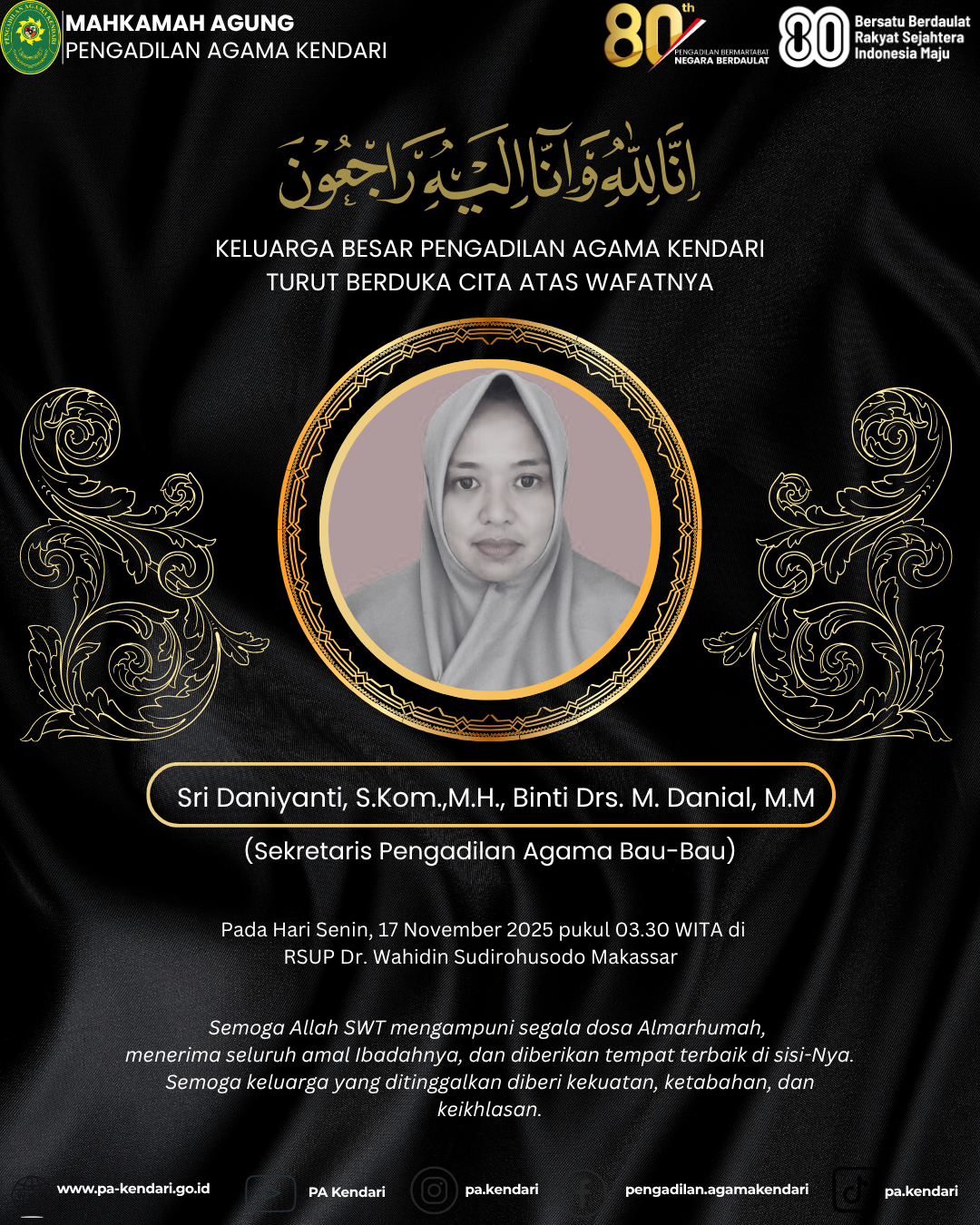 Segenap Keluarga Besar Pengadilan Agama Kendari dengan penuh rasa duka cita yang mendalam, mengabarkan berita wafatnya: