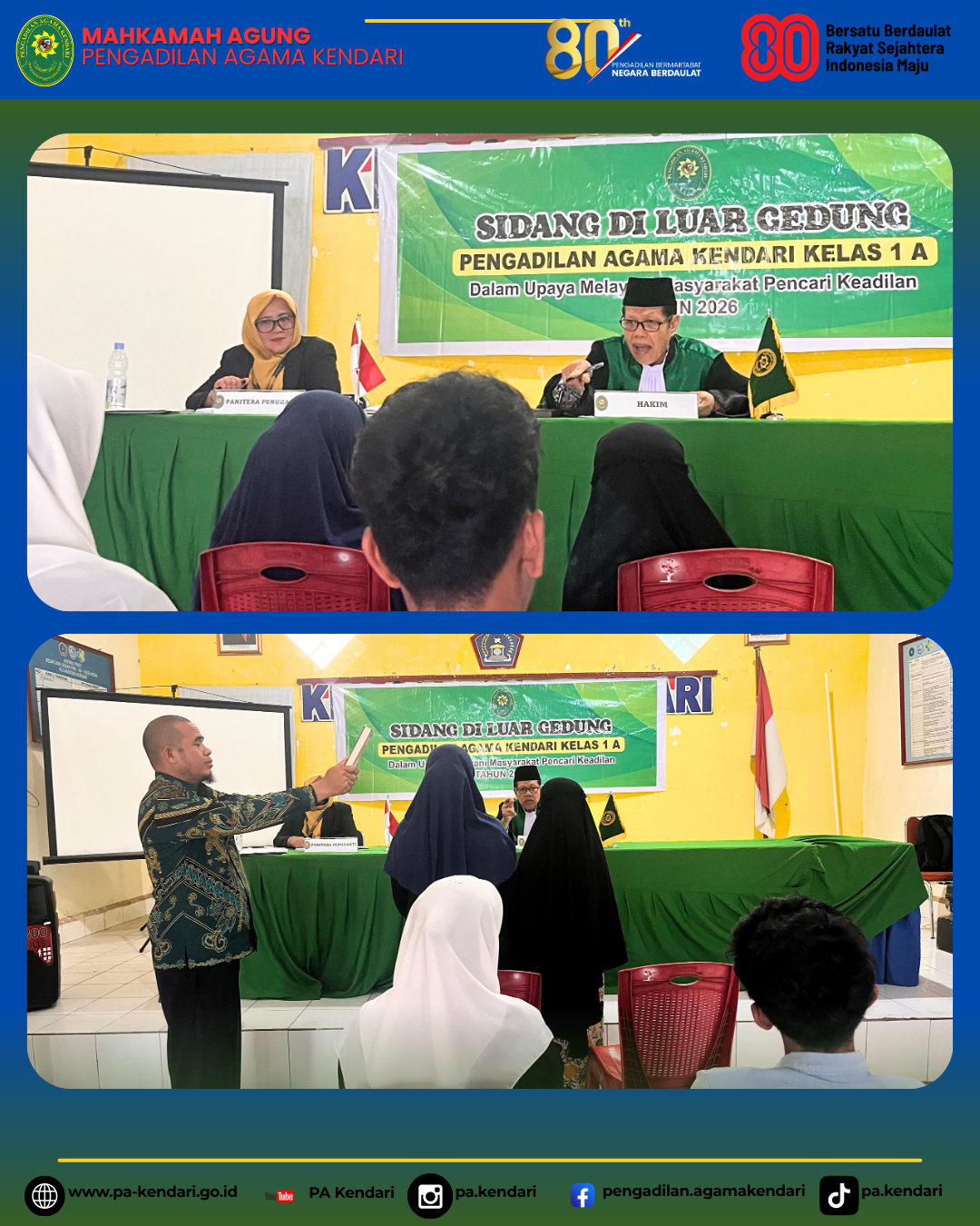 Kendari – Dalam rangka memberikan pelayanan prima dan mempermudah akses keadilan bagi masyarakat, Pengadilan Agama (PA) Kendari kembali melaksanakan Sidang di Luar Gedung (Sidang Keliling) pada Kamis, 9 April 2026. Kegiatan ini bertempat di Kantor Kecamatan Kendari, Kota Kendari. Sidang keliling ini menyasar masyarakat pencari keadilan yang berdomisili jauh dari kantor pengadilan, guna menghemat biaya transportasi dan waktu. Tim PA Kendari yang bertugas melayani sejumlah perkara perdata agama, yang hari ini disidangkan yakni perkara itsbat nikah dengan prosedur yang sama seperti sidang di kantor.
